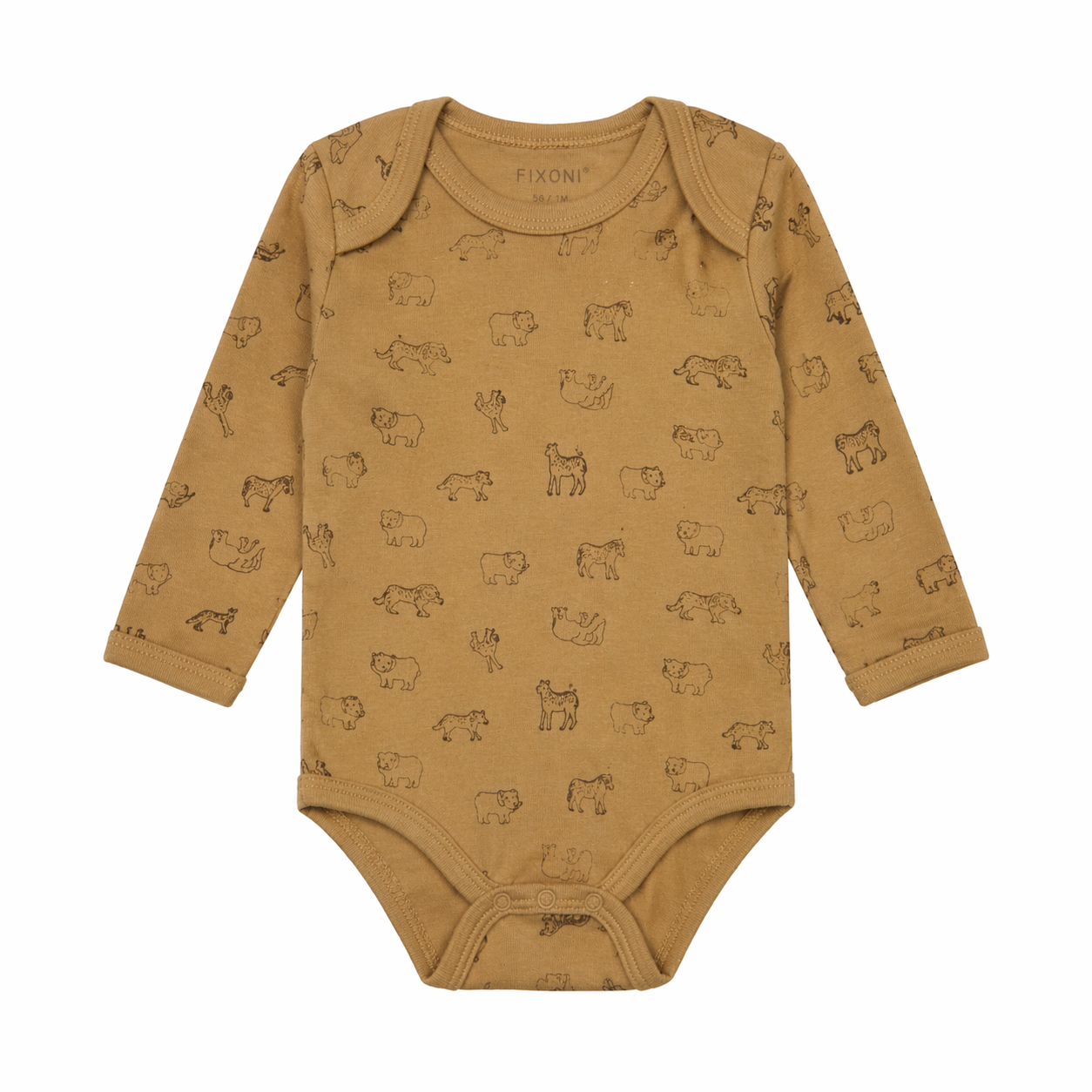 Langermet body fra Fixoni i 100%bomull. Bodyen kan enkelt tres av nedover beina, om det skulle være lettere enn å tre den over hode.