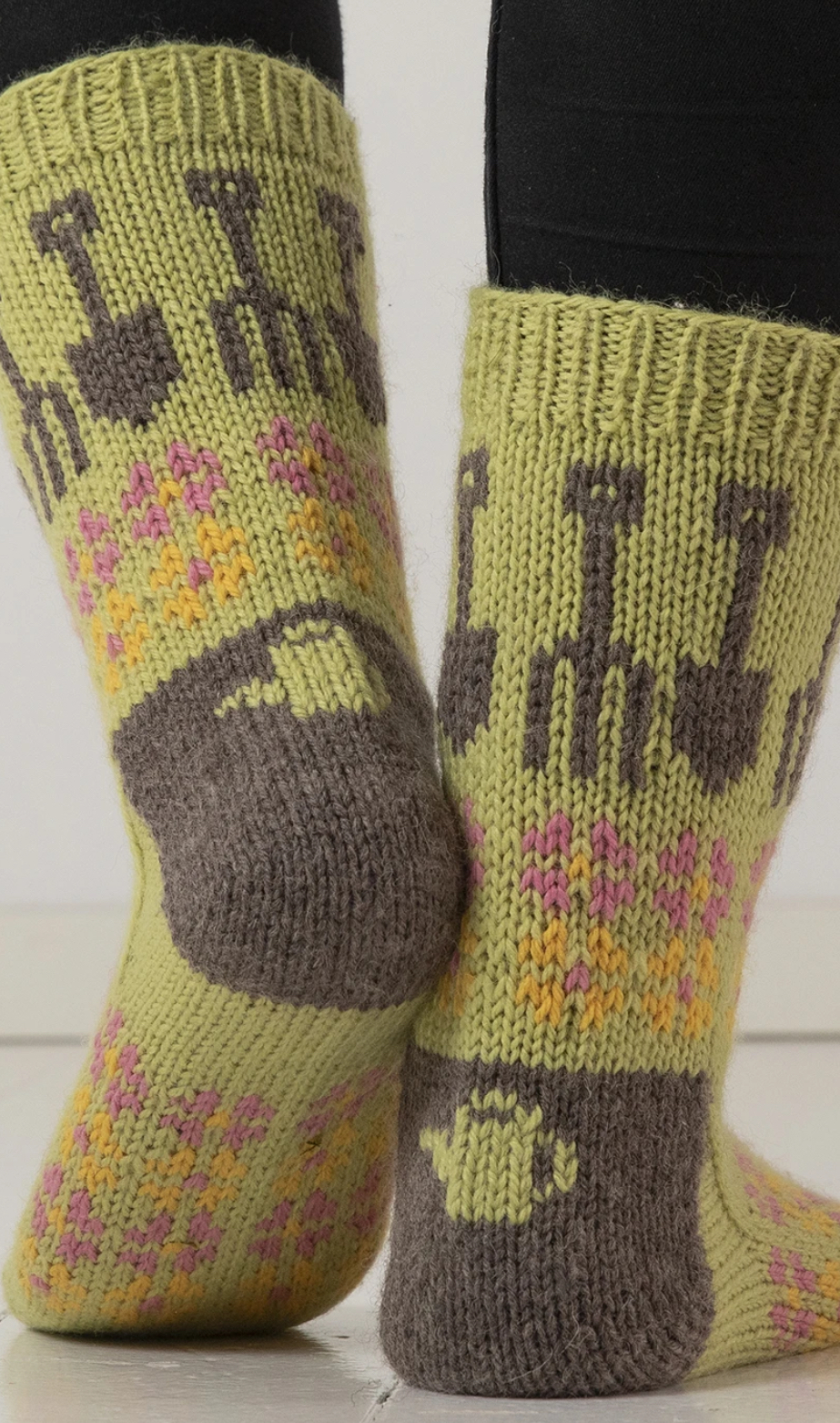 Flere som liker seg ute i hagen? Da er disse gartnersokkene fra Viking Garn helt perfekte! Gøy design som i tillegg varmer på beina.
