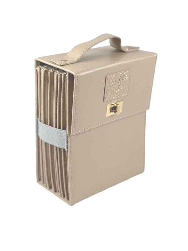 Rundpinnemappen er laget av topp kvalitet kunstlær. Den har 14 lommer, det er plass til flere rundpinner i hver lomme.