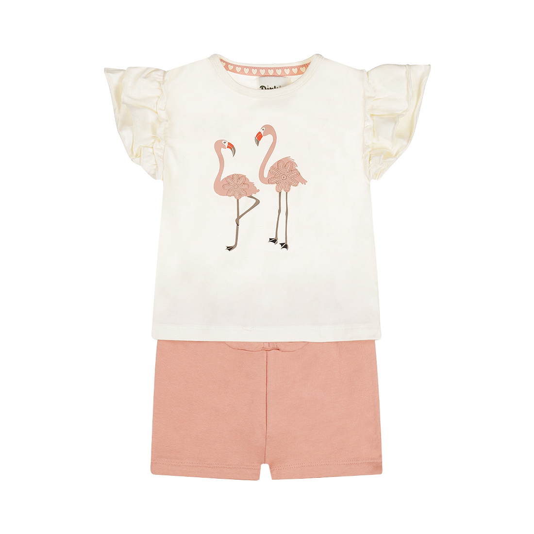 Nydelig sommersett med t-skjorte og matchende shorts. Settet er i bomull med flamingomotiv.