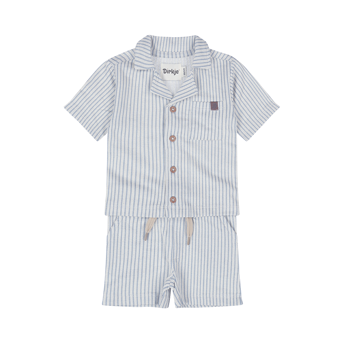 Nydelig sett til someren og varme vårdager. Settet inneholder en kortermet skjorte og en shorts, begge med matchende striper.